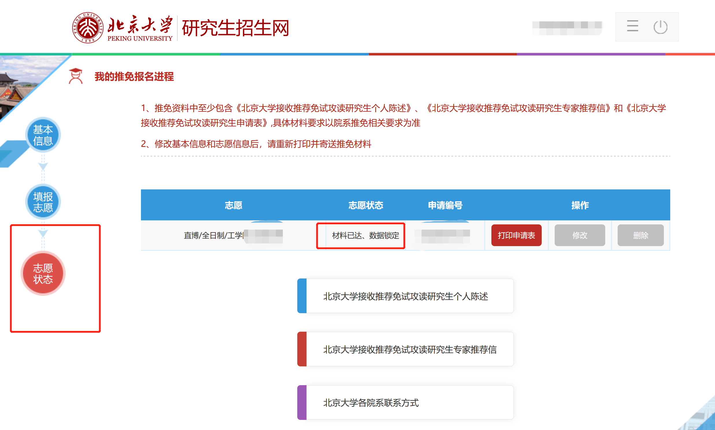 答:登录报名系统后,不要填写基本信息,直接点击下一步,再点击左边的志愿状态,如果中间状态条中显示志愿状态为材料已达,数据锁定,就表示已经收到材料了。