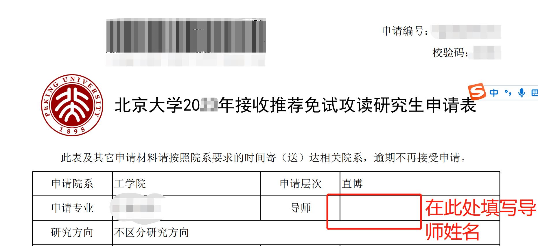 (6)报名成功后,学术型直博生请在申请表(材料1)报考专业后面手动填写拟报考导师姓名。如图所示,学术型硕士无需写导师姓名