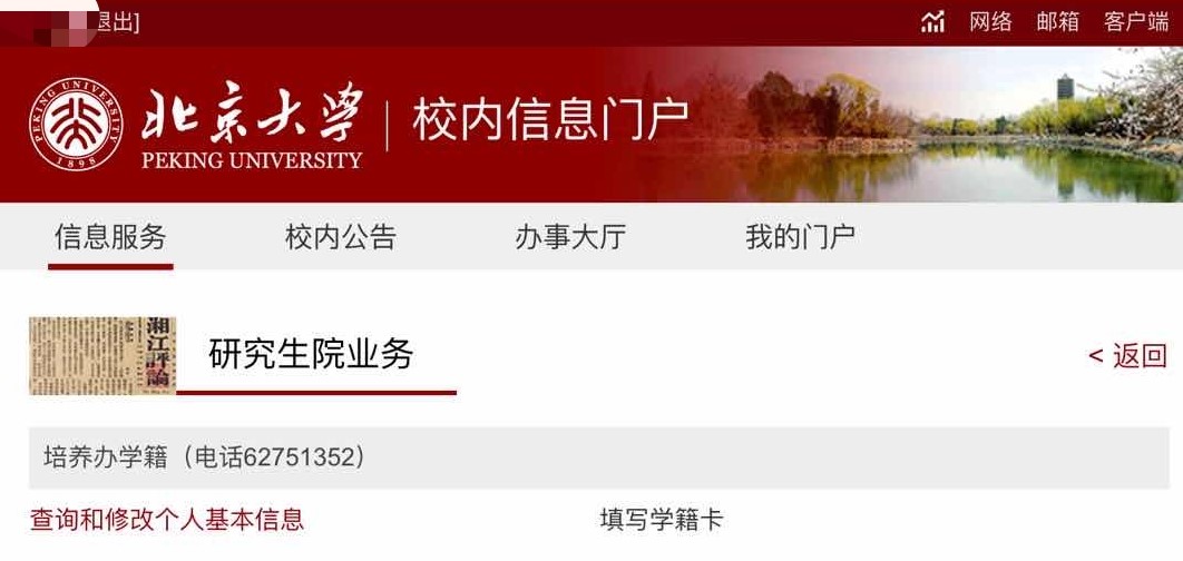 登陆“校内门户”→点击“信息服务”→在搜索框搜索“研究生院”→点击“研究生院业务”→在“培养办学籍”栏目中找到“查询和修改个人基本信息”。信息核对无误后,点击左上方“确认毕业信息”按钮。