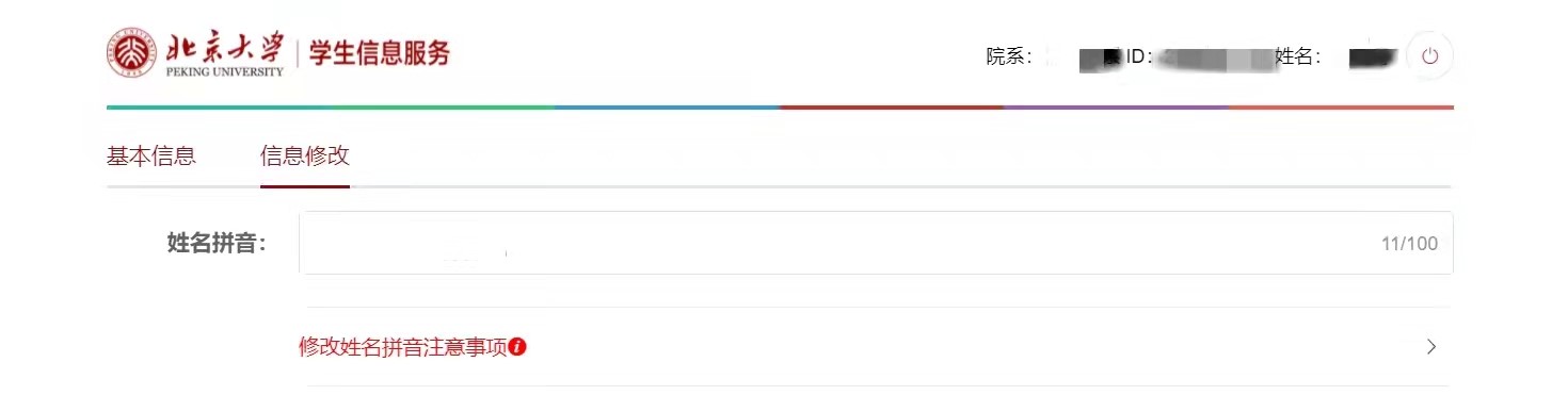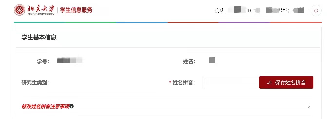 请相关研究生认真核对校内门户中的姓名拼音信息。研究生校内门户中的姓名拼音信息将作为重要学位授予信息上报教育部,用于制作学位证书及英文证书副本,一经上报将无法修改。此次为研究生个人核对修改姓名拼音信息的机会,请通知研究生务必高度重视、认真核对并及时修改。
