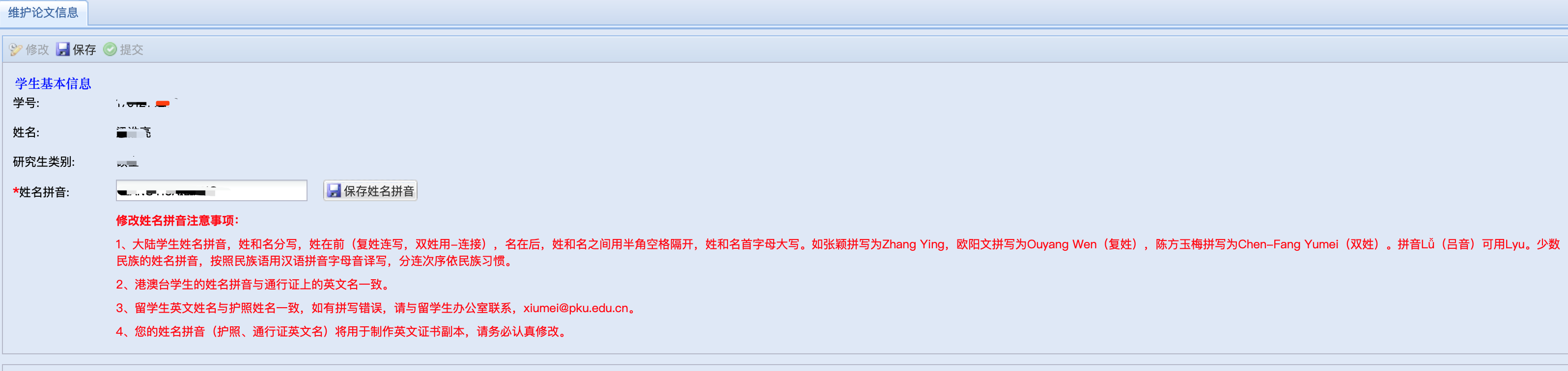 在分会审议学位之前,研究生可在维护论文信息界面核对和修改信息。登录校内门户-研究生院业务-提交学位申请-员工基本信息-修改姓名拼音。重申学位(重新答辩)的研究生也可通过此方式修改。
