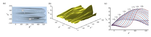 (a)Tomo-PIV速度场反演的低速条带 (b)条带內三维波物质面(c)三维波法向振幅随时间演化