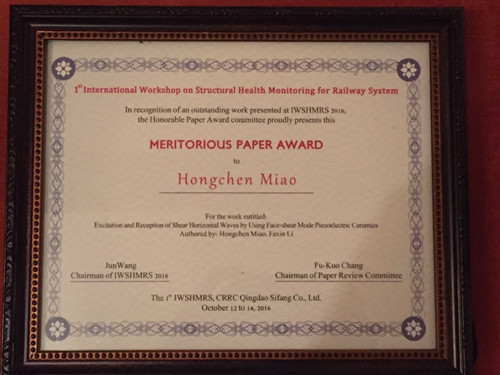 这项工作也引起了业内的广泛关注和好评。在刚刚结束的第一届轨道交通健康监测国际研讨会上(中国青岛,2016.10.12-14),课题组的论文“Excitation and Reception of SH0 waves by using face-shear piezoelectric ceramics ”被评为最佳论文一等奖(Meritorious Paper Award)。评审委员会主席为Structural Health Monitoring杂志主编、斯坦福大学Chang Fu-Kuo教授,评审委员包括英国皇家科公司和工程院两院院士、帝国理工机械系系主任Peter Cawley教授等领域内权威学者。美国Georgia Tech Inst航空系讲座教授M. Ruzzene评价该工作为“very good, very important”。