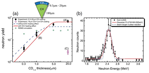 在ICF间接驱动柱腔实验中,纳秒激光从上下两个注入孔注入(近)真空Au腔(见图1),Au等离子体向外膨胀,同时Au腔驱动的X射线会辐射烧蚀位于中心的靶丸,靶丸烧蚀CH等离子体与Au等离子体膨胀方向相反,最终会在中间区域相遇并发生动理学效应。但是,由于动理学效应驱动的数十keV质子不可能穿透靶丸和黒腔壁,为不可观测物理量。如何排除干扰将其诊断是实验成功的关键,这也是困扰美国LLNL实验室同行们的难题。CAPT与中国工程物理研究院团队在神光III原型上巧妙地解决了这一难题。在其实验方案中,采用了如下两个创新性的物理思想:(1)将普通球壳靶丸改为实心CH球表面涂氘代GDP(简称CD)来表征动理学效应。实心CH材料可以完全排除内爆中子和流体力学不稳定性的干扰,通过CD涂层将不可观测的数十keV质子转变为D离子,并利用D+D?He3+n(~2.45MeV)反应中子信息来表征动理学过程,由于能量为MeV的DD中子穿透能力强,很容易穿过Au腔壁并被中子探测器探测,这就解决了动理学引起的微观效应难以穿过腔壁被探测的难题。(2)改变CD涂层厚度获得DD中子产额与动理学效应的依赖关系。实验中采用辉光放电聚合技术实现了CD涂层厚度跨越两个量级(0.3mm~20mm),实验发现中子产额随着CD涂层厚度的增加呈现饱和增长的趋势(图2a),明显偏离辐射流体RDMG模拟结果,这说明中子产生机理不是热核反应主导。进一步实验发现涂层为19mm CD + 1mm CH(图2a中 C点)中子产额相比涂层为20mm CD(图2a中A点)下降一个量级,证明了起主导作用的是动理学效应导致的DD束靶反应机制,而不是与Au\CD等离子体的离子碰撞加热机制。此外,团队还利用塑料闪烁体大阵列测量了中子能谱(图2b),半高全宽为282keV,考虑到实测中子产额的约束条件,如此大的能谱展宽无法用热核反应机制解释,这进一步证明了动理学束靶反应机制的合理性。