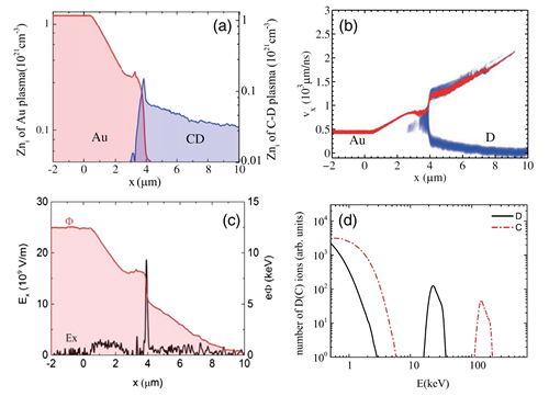 为了解释DD束靶机制的来源,团队首先利用辐射流体模拟给出腔壁Au等离子体和辐射烧蚀的CD等离子体相遇时的初始状态,再利用粒子模拟程序(PIC)计算后续动理学过程(图3)。模拟结果显示Au\CD等离子体界面存在较高的电子温度梯度和电子密度梯度,最终会在CD等离子体中驱动静电冲击波,静电冲击波会反射界面附近等离子体中的D离子且能量达到几十keV,这就是DD束靶反应中“D束”的来源,同时整个辐射烧蚀的CD等离子体自身提供“D靶”。基于束靶机制,团队细致计算了D离子在CD等离子体中输运、能损,以及发生DD束靶反应的时空分布和中子能谱形状,计算的中子产额和中子能谱分布都与实验结果符合得非常好(见图2中曲线)。