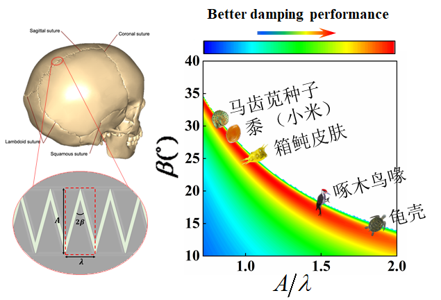 集高刚度、强度和优异阻尼性能于一体的高性能先进复合材料在航空航天、能源和高速交通等领域有广泛的应用。然而,传统阻尼材料难以兼顾上述各类力学性能。相比之下,自然界的生物复合材料却通过微观结构设计实现了优异的刚度和强度等静态承载能力与阻尼性能的共存。例如,动物的头骨、啄木鸟喙、海龟壳、马齿苋种子等生物材料中都发现了不同尺度的缝合线(suture)界面结构。