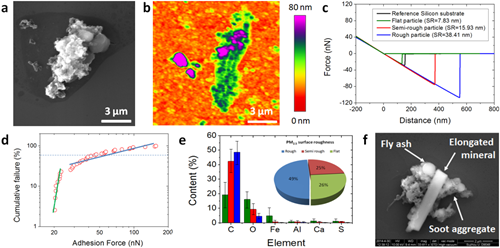 图:(a) 和 (b) 分别为表面很粗糙的PM2.5煤烟聚集物(soot aggregate)的扫描电子显微镜 (SEM) 和原子力显微镜 (AFM) 图。 (c) 为在表面粗糙度不同的颗粒上所做的力-位移曲线。(d) 为颗粒粘附力的威布尔概率图。数据收集于两组不同的PM2.5颗粒上(分别为表面粗糙低和高的颗粒)。(e) 为颗粒的化学成分柱状分布图。颗粒按表面粗糙度划分为三类,数据通过扫描电子显微镜/ X光能量色散谱分析得到。(f) 为一个煤烟聚集物(soot aggregate)将球状浮尘和长条状矿物灰尘聚集在一起的例子。