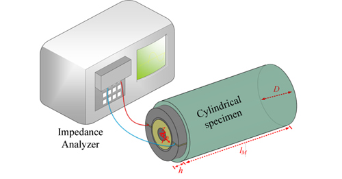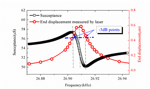 李法新课题组基于前期接触振动测量模量方法的积累,提出一种改性的压电超声复合振动方法(M-PUCOT),将厚度振动或扭转振动的压电圆环与圆柱状样品粘在一起(图1),来激励样品的纵向振动或扭转振动,通过测量压电圆环的导纳曲线(图2中黑线),利用谐振频率和反谐振频率,可直接显示求出样品的模量(杨氏模量和剪切模量)和对应的损耗。值得注意的是,该谐振频率和反谐振频率即是传统共振曲线的两个半功率点。实际上,该方法的核心思想就是将传统的样品共振曲线测量转化为换能器-样品复合系统的阻抗曲线测量,达到既准又快的效果。其测量模量的重复性误差小于0.2%,测量损耗的误差小于2.5%,精度比美国ASTM1875现行标准高一个数量级。测量时间只要2秒,而且只需加一段隔热的石英棒就可方便地测量变温条件下的模量和损耗。