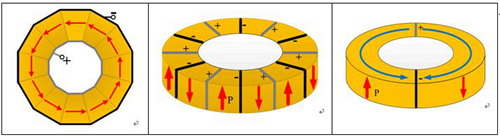 图4. 第三代:全向型SH波压电换能器:(左)基于12片d24型压电片;(中)基于厚度极化d15型压电圆环12等分;(右)基于厚度极化d15型双半圆环