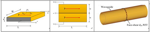 图3. 第二代:基于面内剪切d24型压电片的十字指向型SH波换能器(左)、双向聚焦型SH波换能器(中),以及用于管道的扭转导波换能器(右)