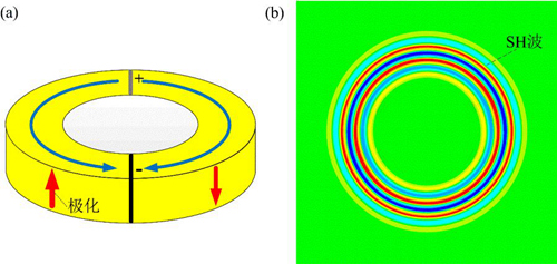 图1. 双半圆环SH波换能器及其激励的全向性SH波
