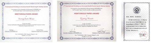 上述发展的SH波换能器已经在美国Tufts大学,北京理工大学,厦门大学、大连理工大学等单位得到了应用,反响很好。相关工作先后获得了第一届和第二届轨道交通结构健康监测国际研讨会一等奖(2016,2018,均唯一)、中国铁道学会最佳论文一等奖(2019)等奖项。