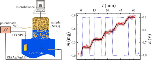 左图,实验装置示意图;右图,电解液在纳米多孔金内的电毛细开关控制