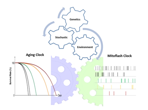 不同的基因背景可影响线虫的平均寿命长短,如daf-2(胰岛素受体)突变线虫平均寿命为39天,而hsf-1(热休克蛋白转录因子)突变线虫仅为15天。通过在29个不同遗传背景中进行系统研究,作者揭示了3日龄超氧炫频率与平均寿命呈负相关,非线性回归分析得出59%的寿命变化可以用超氧炫来预测。除了遗传背景差异,寿命也受到环境因素的影响。在26种不同环境条件下(如限食、热休克、高糖饲喂等),超氧炫的频率可以预测70%的寿命变化。即使对于同一遗传背景、同一环境条件中的群体,它们的个体寿命受随机因素影响而变化,3日龄秀丽线虫超氧炫频率依然保持与个体寿命负相关的规律,而9 日龄超氧炫频率与个体寿命则没有相关性。进一步实验还解释了在daf-2突变虫株中,通过线粒体超氧炫指征的线粒体功能状态反映其寿命长短的机制。