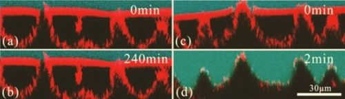 图1,(a),(b)显示在1.5个大气压下,饱和的水中,荷叶表面气层可以长时间稳定存在;(c),(d)表示,在不饱和的水中,气层很快会消失