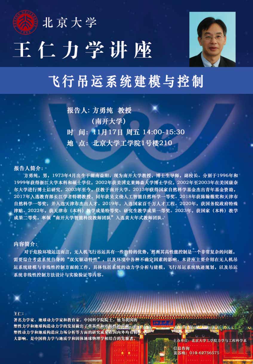 王仁力学讲座【11.17 方勇纯】:飞行吊运系统建模与控制