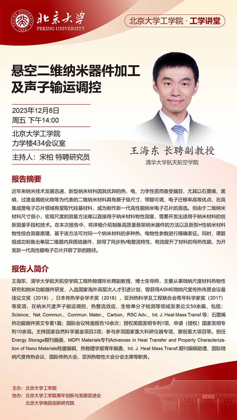工学讲堂【12.8王海东】:悬空二维纳米器件加工及声子输运调控