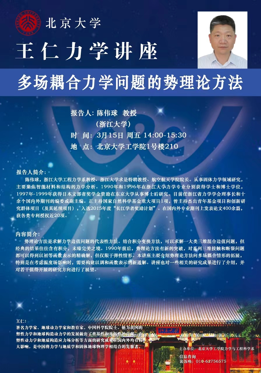 王仁力学讲座【3.15陈伟球】:多场耦合力学问题的势理论方法