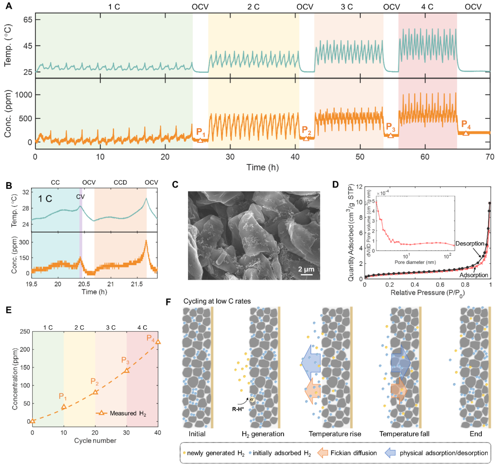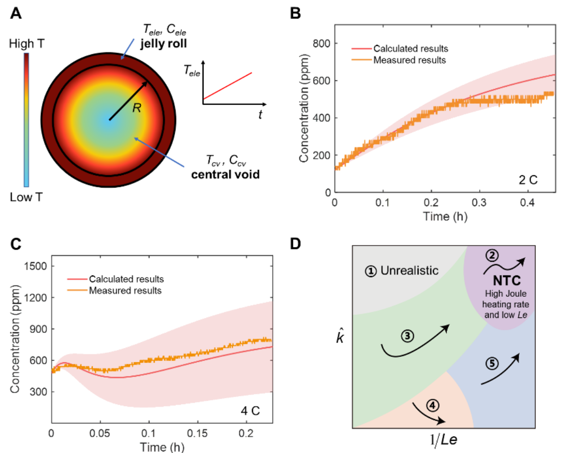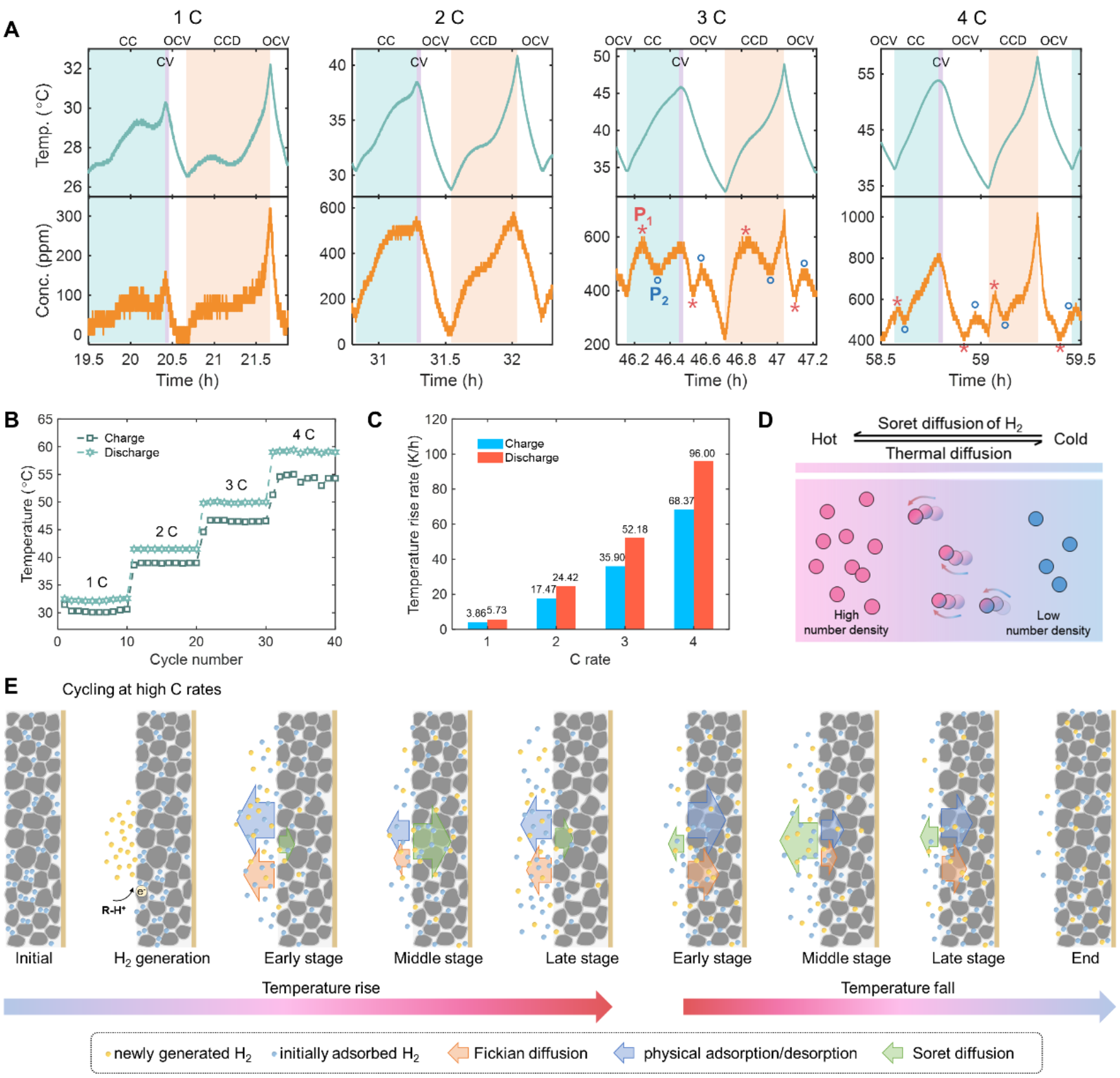 为此,进一步建立了一个描述电池内部氢气瞬态与空间演化的理论模型,涵盖吸附/脱附、Fick扩散、Soret扩散及化学反应等多种机制,系统解释了该NTC行为,认为其源于在高焦耳热效应与电池系统低Lewis数条件下,H2的Soret扩散增强所致(图4)。