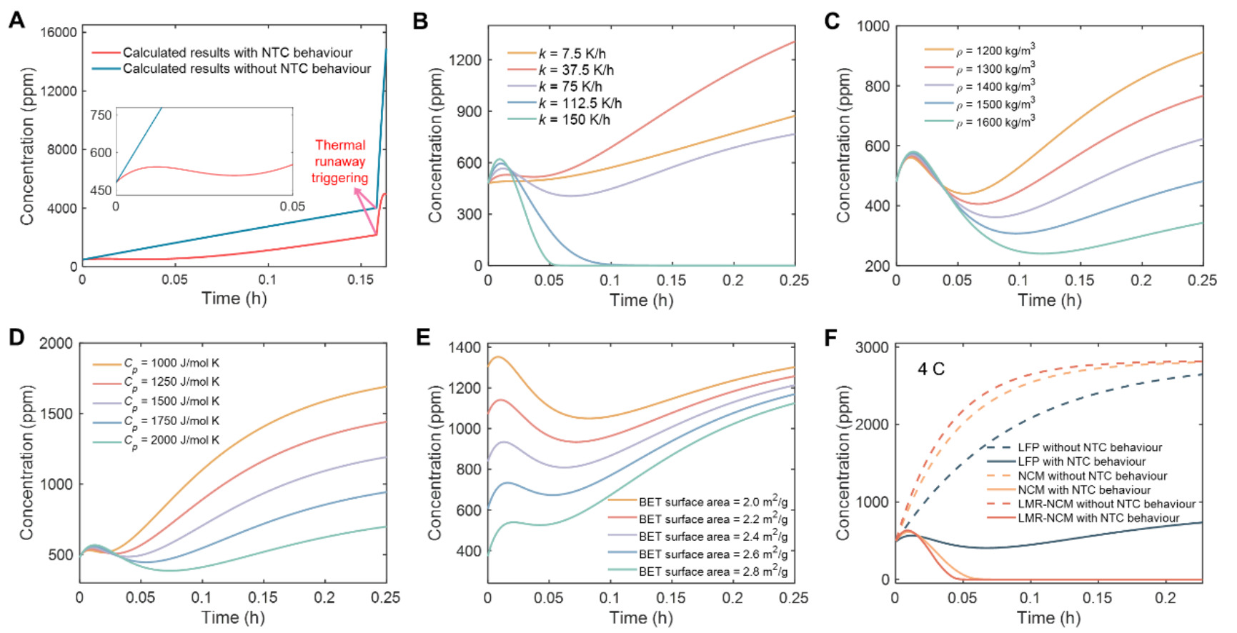 研究阐明了电池热失控过程中H2演化的特征,并为电池的设计与运行提供了安全性指导。对于在外部触发故障情境下的LFP电池,剧烈的升温速率可诱发热失控。研究预测,在不考虑NTC行为的情况下,热失控前后H2的积聚量分别约为具有NTC行为时的2倍和3倍。这表明增强NTC效应有助于降低热失控引发燃烧的风险,提升电池安全性。该研究进一步发现,NTC行为在电池循环中可通过增强焦耳热、降低电解液Lewis数以及提高负极石墨孔隙率等方式显著增强(图5),在此情况下,H2几乎被局限于负极区域,而非进入电池中部空腔。这一发现有望建立新一代智能电池在高倍率条件下的关键安全范式与设计策略,例如提高电解液的密度和热容,采用高孔隙率石墨材料等。此外,该研究还证实,NTC行为对于开发快充型与高能量密度电池亦具有重要优势。
