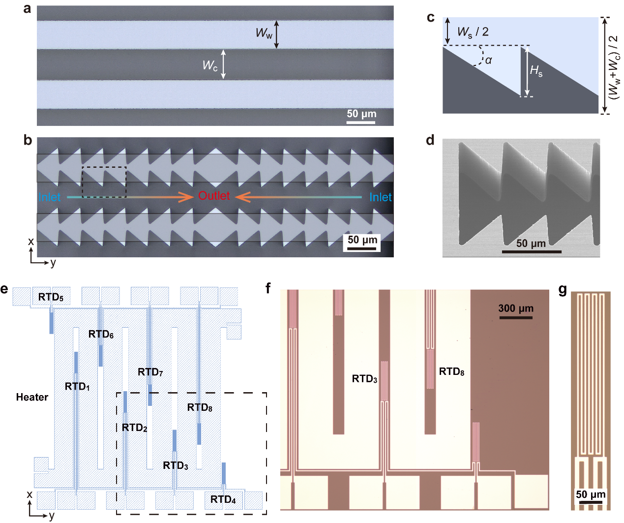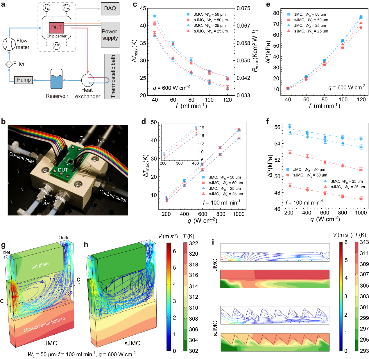 该设计基于硅基微机电系统(MEMS)标准工艺,直接在硅衬底背面刻蚀集成三层微流结构(图1):顶部为变截面歧管层,交错进出口设计通过缩短冷却液在微通道内的流动距离将总体压降控制在极低水平;中间为微射流层,通过射流冲击微通道底部,抑制流动与热边界层,提升局部对流换热;底层构建锯齿微通道网络,有效缓解射流入口阻塞,并进一步增加对流换热面积、破坏流动及换热边界层,从而减小流阻与热阻(图2)。团队共测试了四种芯片变体,包括直通道(JMC, jet-enhanced manifold microchannel)和锯齿通道(sJMC, JMC with sawtooth wall),以及25微米和50微米两种典型通道宽度。