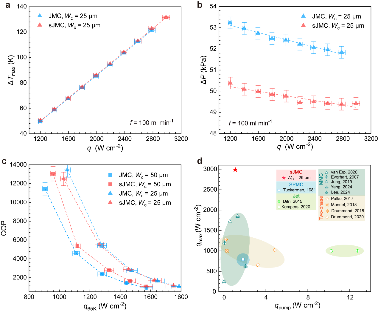 实验结果显示该冷却技术性能优异:在120毫升每分钟的流量下,25微米宽通道的芯片热阻低至0.036 Kcm²/W(图3);锯齿侧壁显著降低压降(例如,50微米宽通道下压降从76.9 kPa降至66.4 kPa),并维持或略优于直通道的冷却性能。在极限性能测试中,冷却超过1000 W/cm²的热流时该方案性能系数(COP)高达13000,此时芯片最大温升仅为65度。在3000 W/cm2的极限工况下,芯片最大温升控制在130度,同时压降低于50 kPa(图4)。