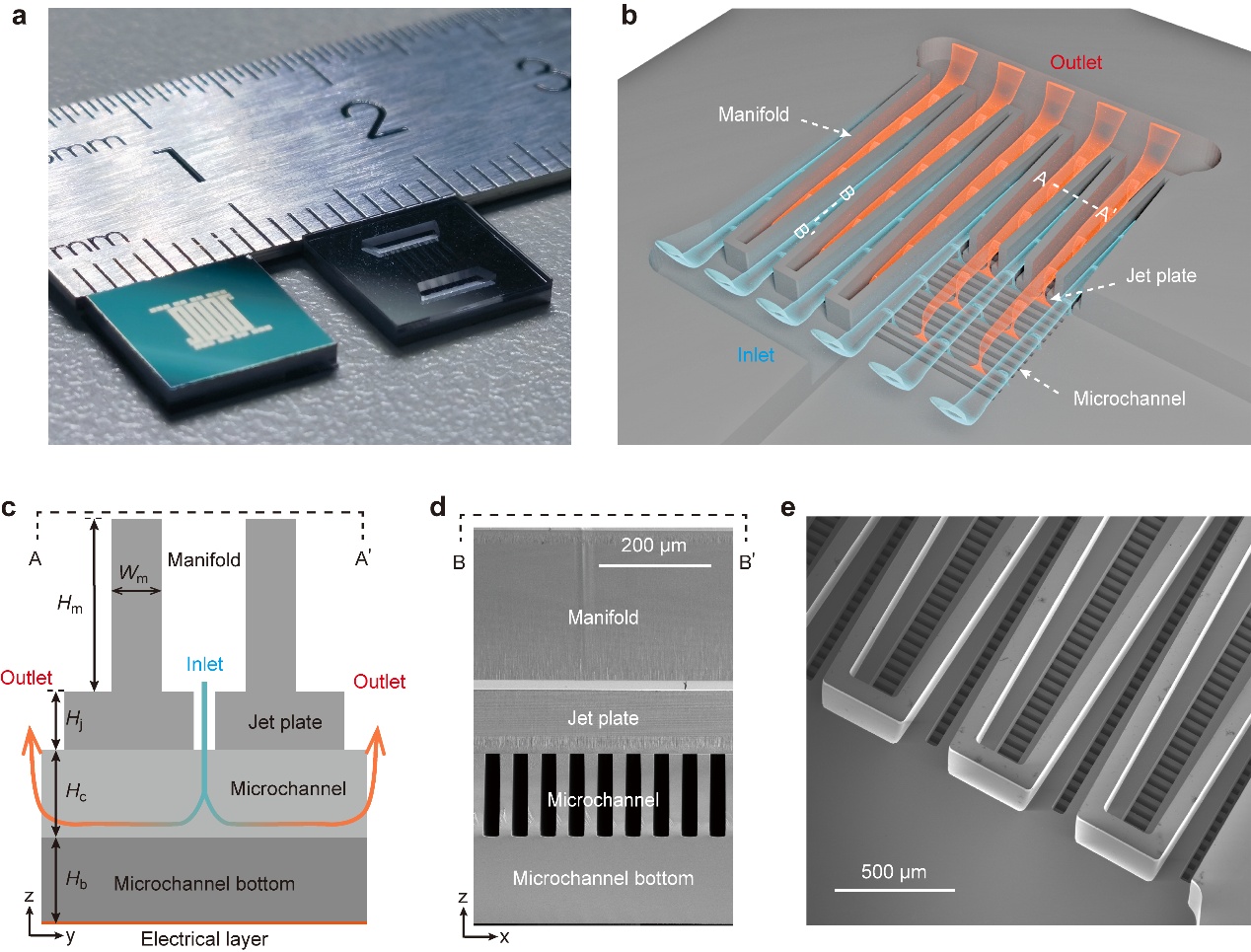 图1:微射流增强的嵌入式岐管微通道冷却芯片