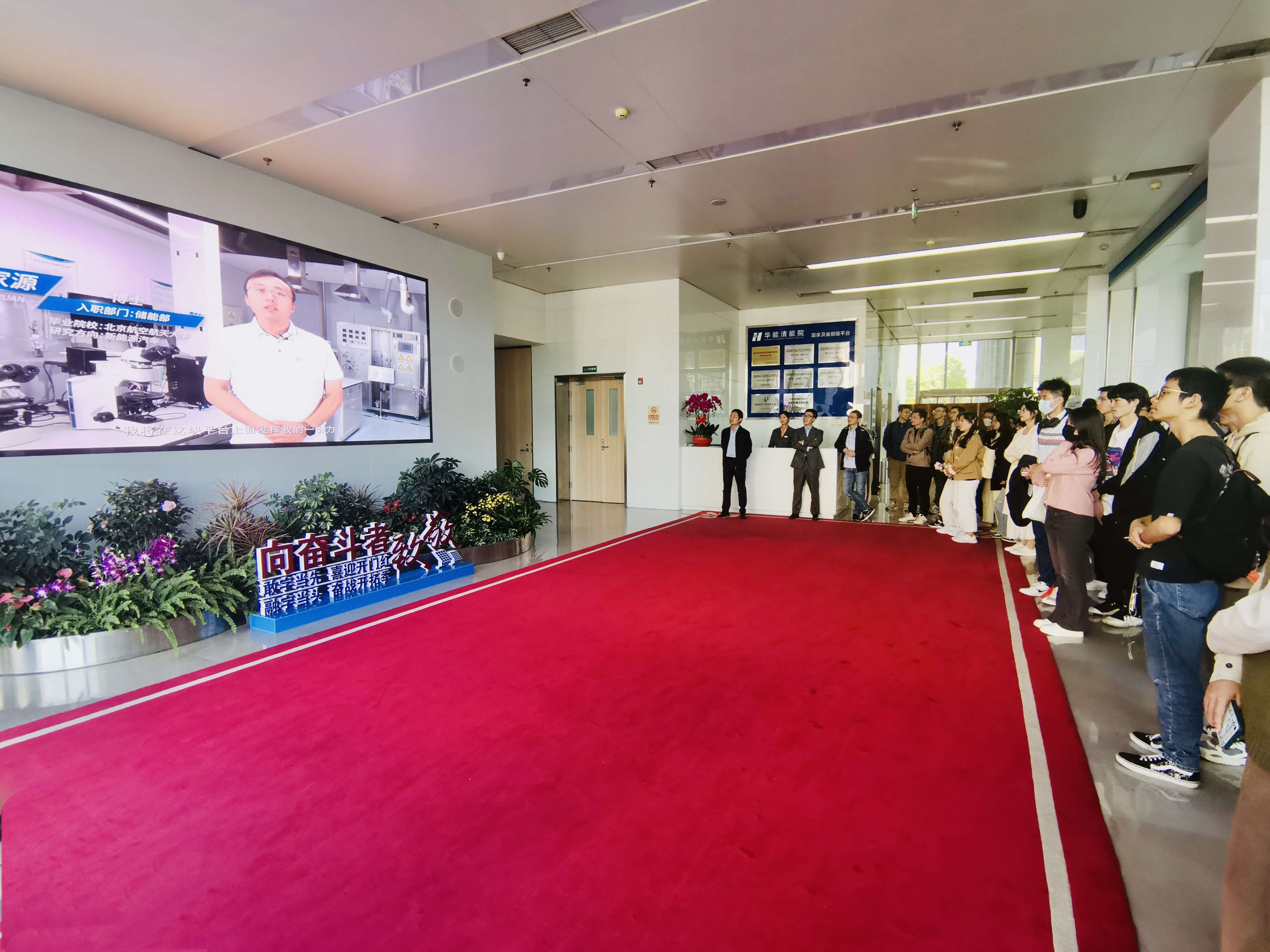 26日中午13:20左右,师生一行到达了华能清能院。经理助理兼人资部负责人李晨和随行工作人员对师生们的到来表示了热烈的欢迎,并通过一则短片为师生们详细介绍了华能集团以及华能清能院的企业规模、发展目标、贡献成果、以及能源战略布局等。