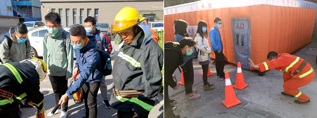 讲座结束后,在工公司邹如强副经理的带领下,由工公司负责安全工作的高景思老师,讲授工公司实验室安全课程的张杨飞老师、高嵩老师,浙江浙大新宇物业集团北京分公司的王路路经理、马朝仿经理、解智佳经理及北京泽成业建筑工程有限公司物业部的史曙光经理共同组织师生和物业人员有序参加实操演练。参与人员以多人为一组的方式,使用灭火器进行模拟灭火,模拟烟雾逃生。大家都积极参与活动,通过实操演练,基本掌握了消防器材的使用方法,也提高了安全防范意识。