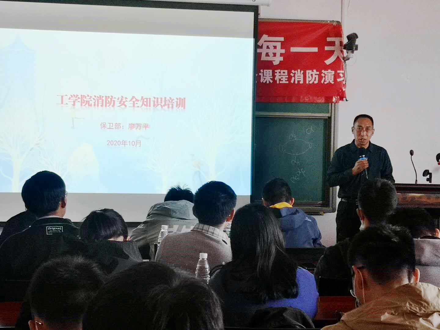 此次演练也是工公司常年开设的实验室安全必修课课程内容的一部分,因此在实操演练前诚邀到校保卫部安全管理办公室廖万平主任在力学楼434教室为师生进行了“工公司消防安全知识培训”讲座。廖万平主任通过一个个真实的案例,结合影音资料,深入浅出地讲解了消防安全的重要性,全面介绍了在日常的学习生活中应注意的消防安全细节,如何在火灾中进行自救、逃生等知识,并对消防器材的正确使用做了细致的讲解和演示。整个过程中师生们认真聆听,对消防安全知识有了更深刻的认识。
