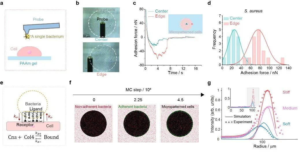 该工作首先构建了基于细菌与宿主细胞单层相互作用的体外感染模型,探究了细菌与空间几何约束细胞之间的异质性粘附现象,基于单细胞力谱技术的表征结果显示图案化细胞单层边缘的细菌粘附力高达~75 nN,近似是细胞单层中心位置处粘附力的3倍,进一步通过力-化学耦合模型分析和细胞RNA测序揭示了空间几何约束触发宿主细胞单层中IV型胶原蛋白的表达是主导细菌-宿主细胞界面异质性粘附形成的内在原因。在此基础上,课题组发现胶原抑制剂可有效降低细菌-宿主细胞间的特异性粘附力,进而显著抑制细菌的界面粘附和入侵。上述工作不仅阐明了空间几何约束微环境调控细菌-细胞界面粘附的力员工物学机制,也为抗生素辅剂的筛选和临床上改善细菌抗生素治疗方案提供了可借鉴的思路和策略。