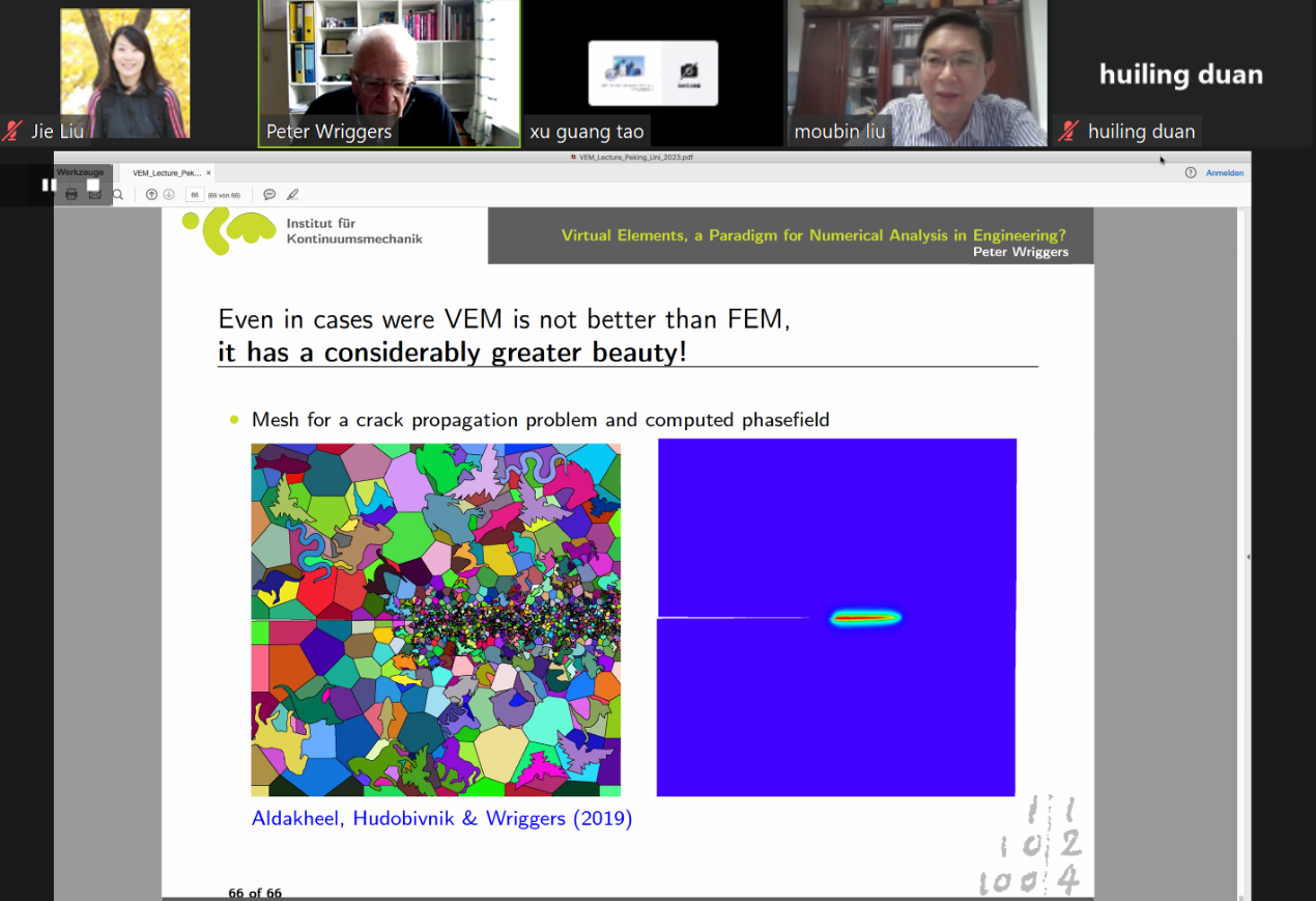 在此次报告中,Wriggers教授重点介绍了虚单元法(VEM)及其在工程数值分析中的广泛应用。作为一种近似偏微分方程描述问题的方法,虚单元法具有可以使用任意几何形式网格元素的优点,简化复杂网格,为离散化提供极大的灵活性,可模拟线性、高度非线性及多场耦合问题,已被广泛应用于固体和流体力学领域,包括单边约束的处理、接触、裂缝等各种问题和工程应用中。报告最后,听众与Wriggers教授进行提问互动,并期待将来邀请Wriggers教授来访进行面对面交流。
