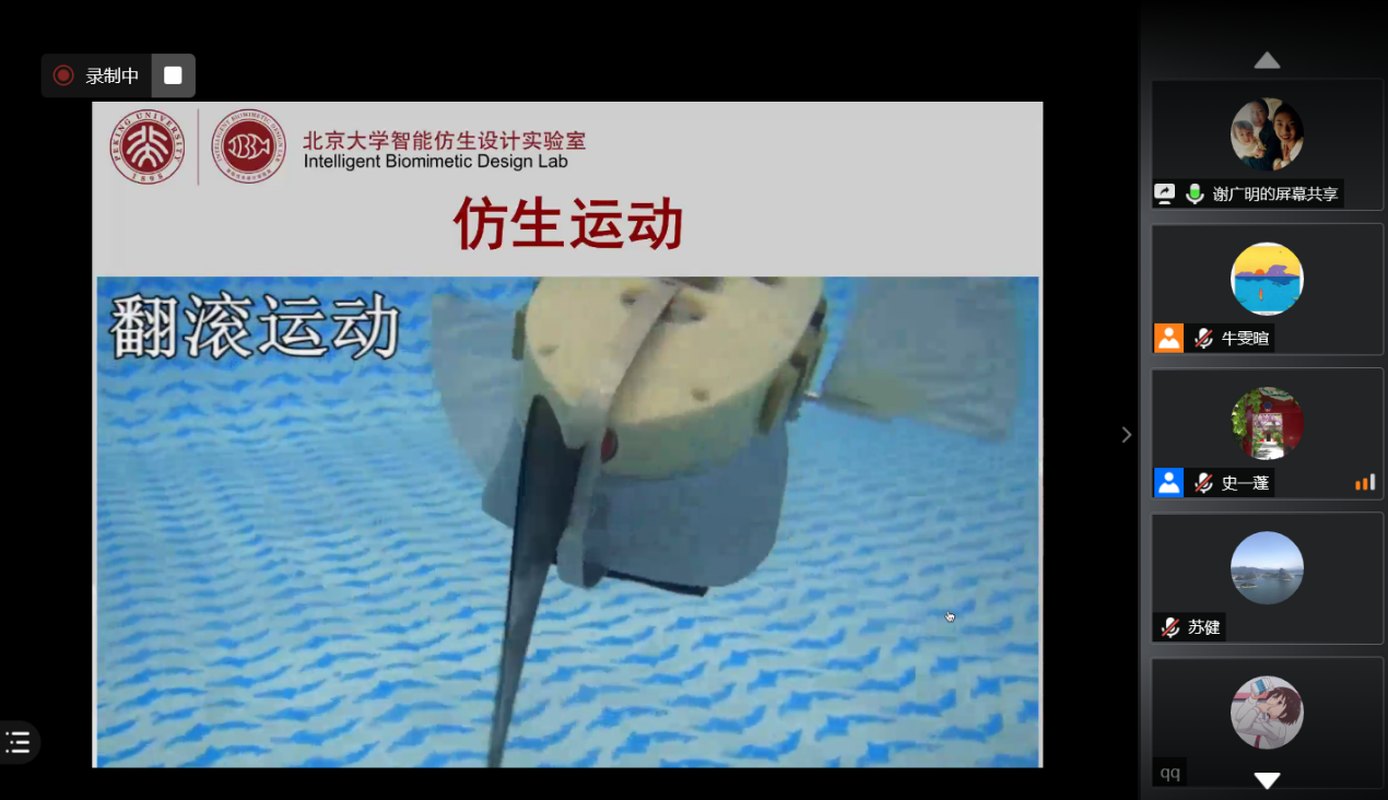 谢广明老师以“魅力机器鱼”为题,从各类水下生物出发,向大家展示了水下生物经过亿万年进化适应水下各种复杂环境的情况,在国家海洋强国发展战略需求指引下,水下机器人大有可为。谢老师着重介绍了其课题组研究的仿生鱼水下推进系统、仿生感知研究、机器和生物交互等方面的科研进展。同时还介绍了由其课题组组织创立的国际水中机器人竞赛,以及科研成果的产业化和军事应用等方面的情况,并向大家展示了科学研究工作真正走入社会、解决实际问题的美好前景。