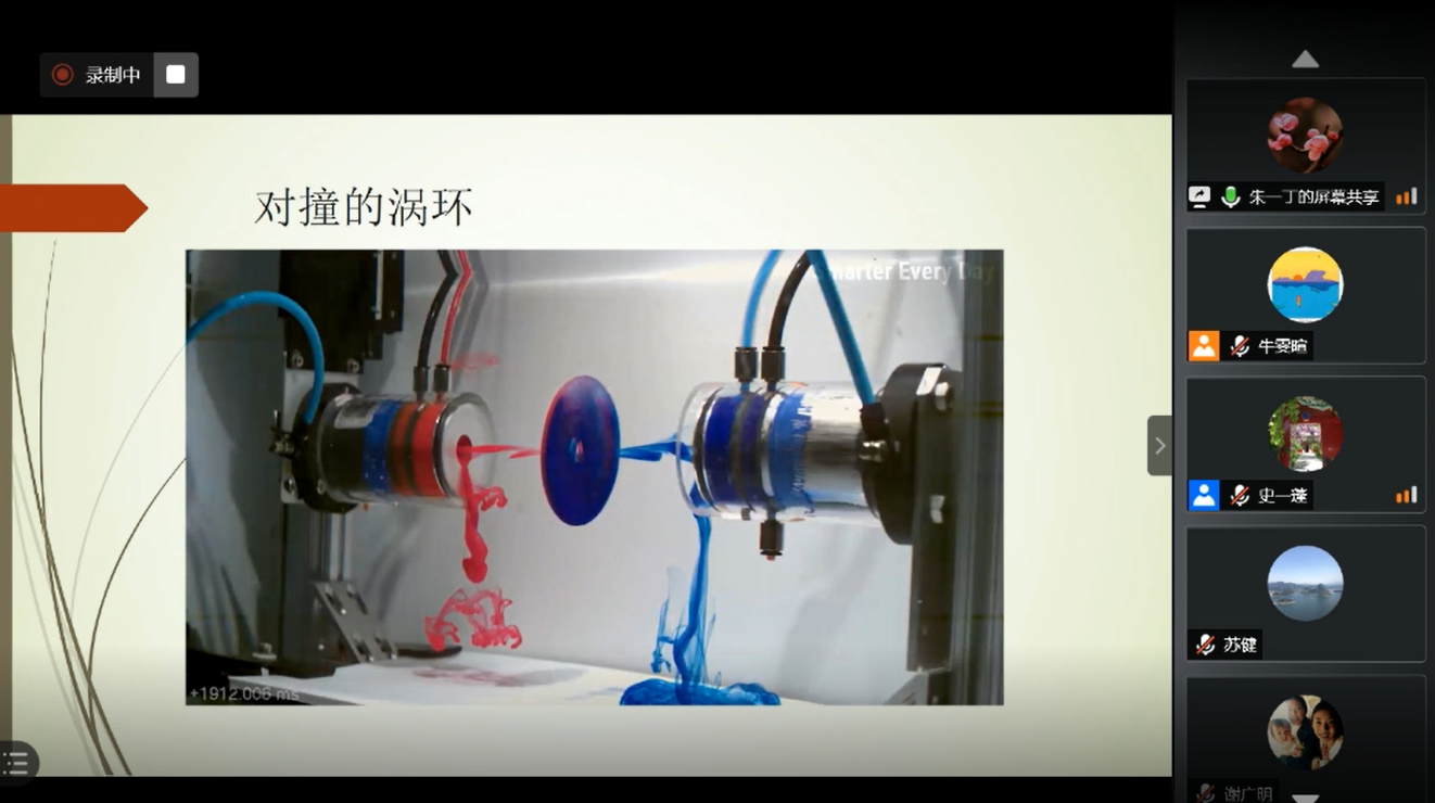 朱一丁老师以“流动中的光和影”为题,讲述了流动显示技术和高超声速湍流研究中的先进流动显示与测量技术,他通过引用王勃的《咏风》和韩愈的《春花》,将看不到摸不着的空气流动借用古人的诗词展现出来。朱老师首先选取空气涡环炮、振荡的卡门涡街、飞行中的子弹、风机后的雪花等动画简述了可视化的流动显示。随后,他概述了例子图像测速技术,介绍了其课题组在高超声速飞行器研制中的最新进展以及湍流与复杂系统国家重点实验室高超声速静风洞研究。最后,朱老师讲述了高超声速流动显示和测量技术的要求及测量技术的创新。经过朱老师的讲解,深奥的湍流科学问题在巧妙的实验方法下变得更加直观、形象和生动。