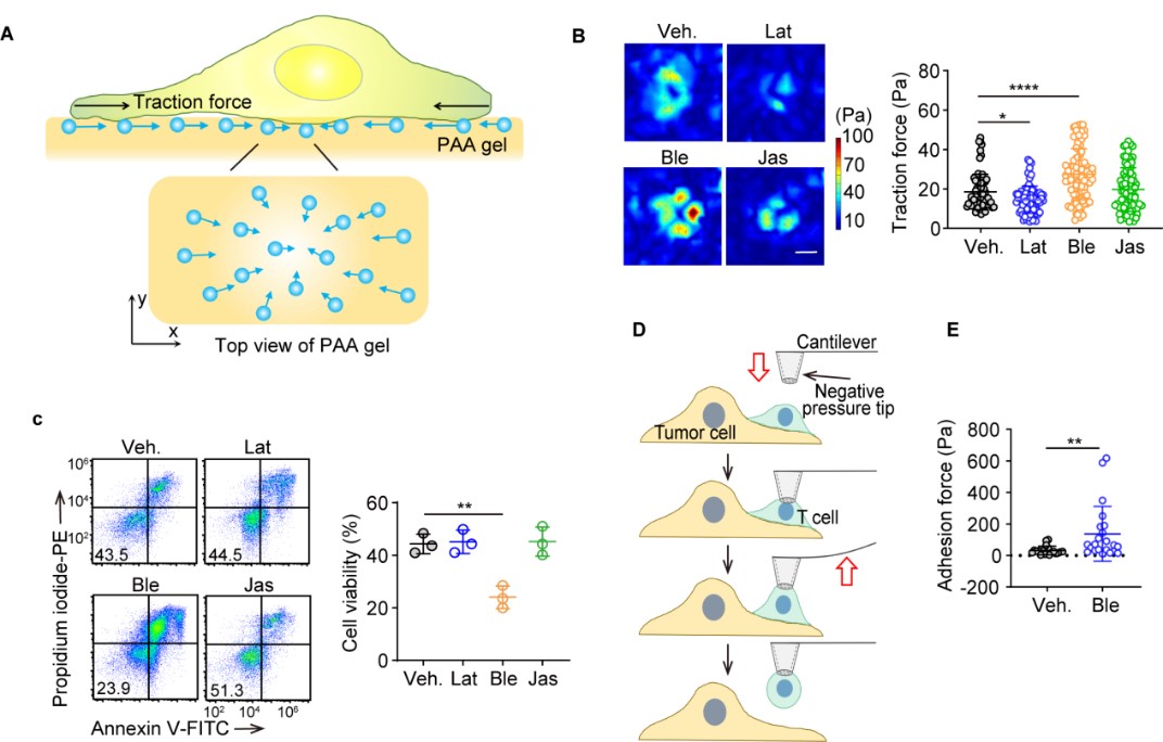 通过使用来自小鼠和不同类型肿瘤患者的T细胞,研究团队发现低剂量非肌肉肌球蛋白II的抑制剂Blebbistatin可以增强T细胞对肿瘤细胞的细胞毒性,且不影响细胞因子的分泌以及颗粒酶B、穿孔素的产生;部分抑制非肌肉肌球蛋白II活性增强了CD8+T细胞的牵引力(牵引力显微镜测量结果),也提高了T细胞与肿瘤细胞间的粘附力(流体力显微镜测量结果),提示非肌肉肌球蛋白II参与调控T细胞肿瘤杀伤效能(图1)。