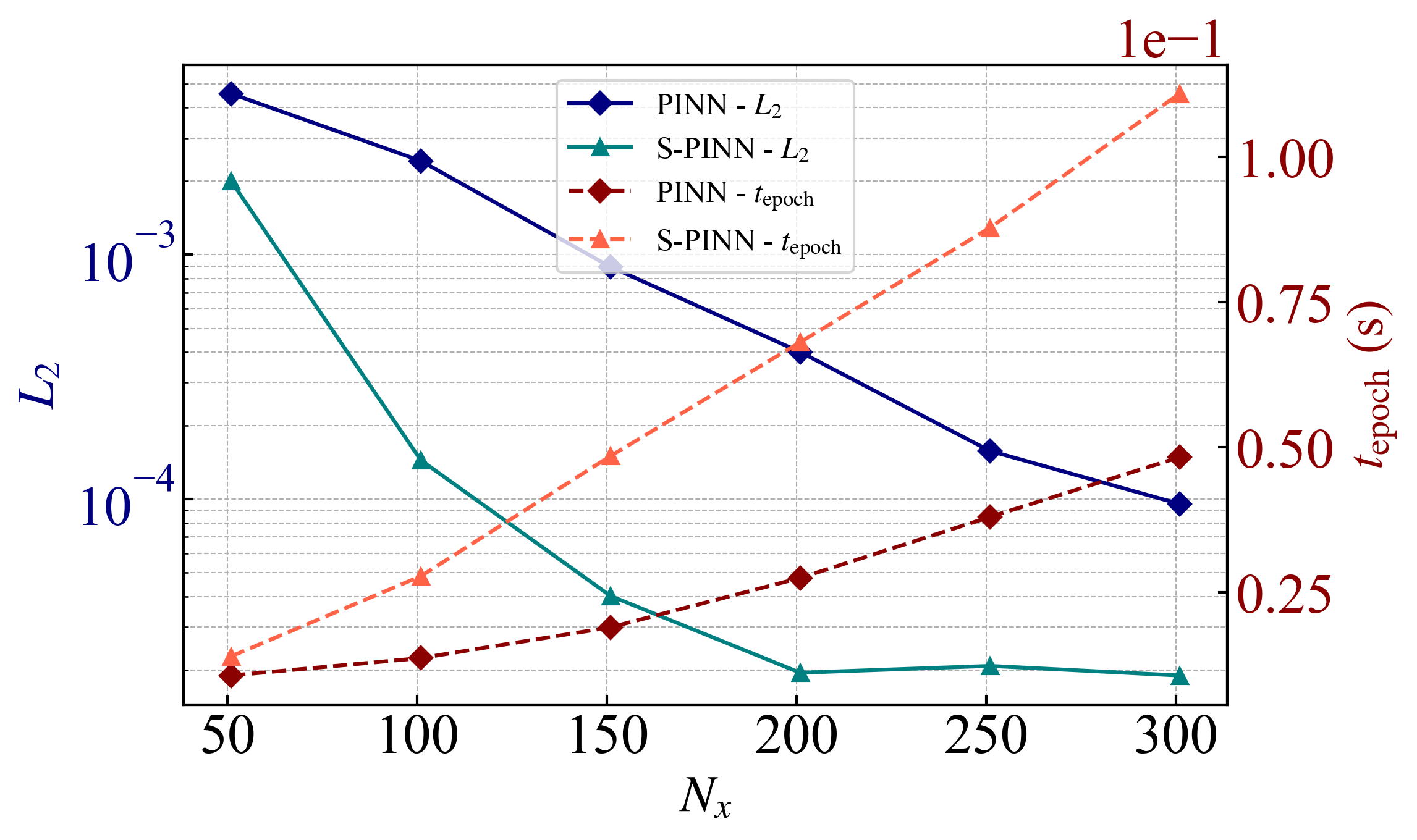 图2: Burgers方程中PINN与S-PINN的精度与效率随离散程度的变化