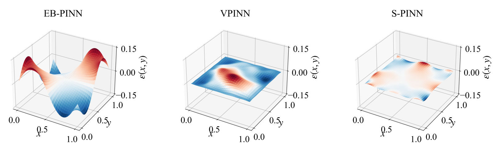 图3:泊松问题求解结果(第一行图)及其守恒性误差(第二行图), 其中EB-PINN为能量型PINN方法,VPINN为变分型PINN方法,S-PINN为该团队提出的新型稳定化PINN方法