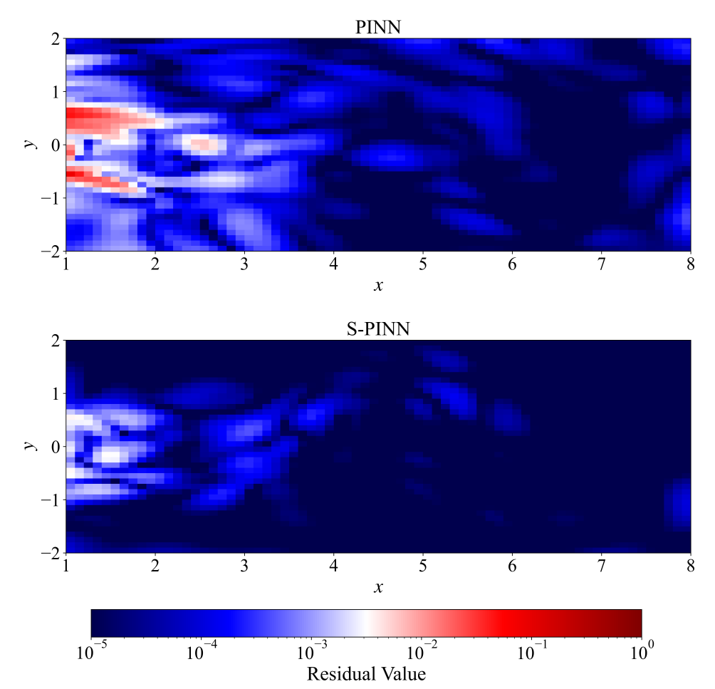 图 4:PINN与S-PINN在圆柱绕流问题中的守恒性误差分布