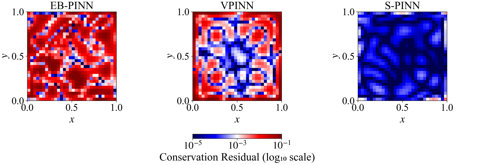 该团队通过压力泊松方程、Burgers方程、三维热传导、三维方腔驱动流及圆柱绕流等一系列经典基准算例,系统验证了S-PINN方法的有效性。结果表明,S-PINN不仅在预测精度上优于传统PINN,在物理量的局部与全局守恒性方面也表现出显著优势(图2–图4)。相比能量型EB-PINN方法,S-PINN在收敛效率与数值稳定性方面均具备突出优势,展现出其在科学与工程计算领域的广泛应用潜力。相关研究成果已发表于计算力学领域顶级期刊《Computer Methods in Applied Mechanics and Engineering》。