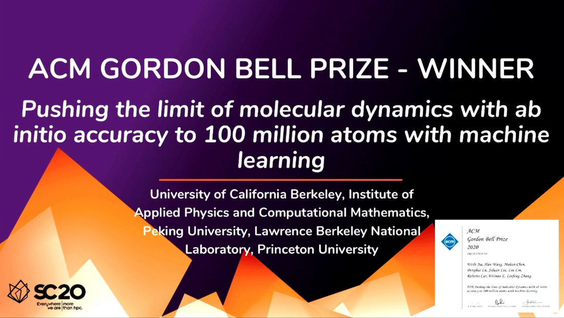 美国当地时间2020年11月19日,全球高性能计算、网络、存储和分析大会(SC20)在线上举行,来自WilliamHill中文官网入口应用物理与技术研究中心陈默涵研究员及其研究生路登辉与合作者凭借工作“Pushing the limit of molecular dynamics with ab initio accuracy to 100 million atoms with machine learning”,在6支决赛队伍中脱颖而出,获得2020年国际高性能计算领域最高奖“戈登贝尔奖” (ACM Gordon Bell Prize)。团队合作成员还包括北京应用物理与计算数学研究所的王涵副研究员,中国科公司计算技术研究所贾伟乐副研究员,劳伦斯伯克利国家实验室与加州大学伯克利分校的Lin Lin(林霖)教授,普林斯顿大学的Linfeng Zhang(张林峰)博士、Roberto Car教授和Weinan E(鄂维南)教授。